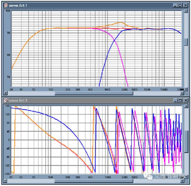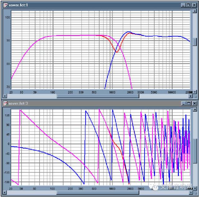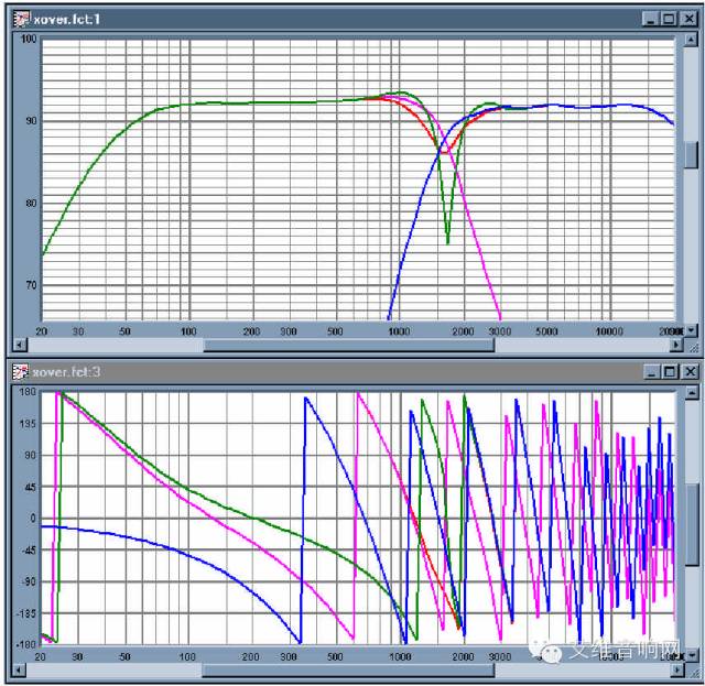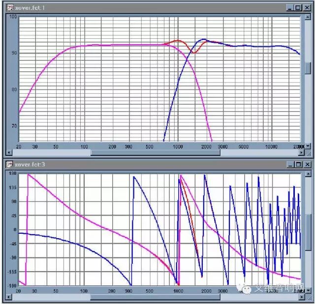 图7:加上分频器的系统的总体声学响应。粉红色-低频,蓝色-高频,红色-总体。分频点在大约1.3KHz
