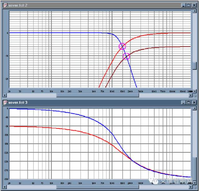 图8:24dB林克威兹–瑞利高通和低通滤波器,在1.3KHz。注意相位响应的重合,所以蓝色相位图不可见