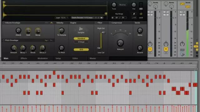 想要音色更具穿透力?试试边击技巧:鼓棒击打鼓边的同时鼓棒尖部击打鼓皮,音量和力度都得到提升。很多鼓音源中会有边击音色采样,你会发现力度值差不多快接近最大。如果想要强调重拍或制造激昂的效果,不妨试试这种打法/音色。